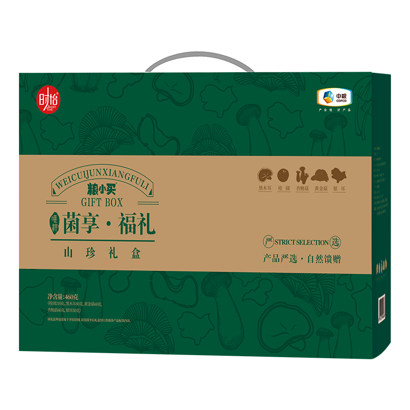 | 净含量/内配 | 净含量:460g 内配: 中粮粮小买黄金菇60g(产地:浙江庆元) 中粮粮小买杏鲍菇60g(产地:福建) 中粮粮小买黑木耳80g(产地:东北) 中粮粮小买银耳50g (产地:福建古田) 中粮粮小买桂圆210g (产地:泰国) |