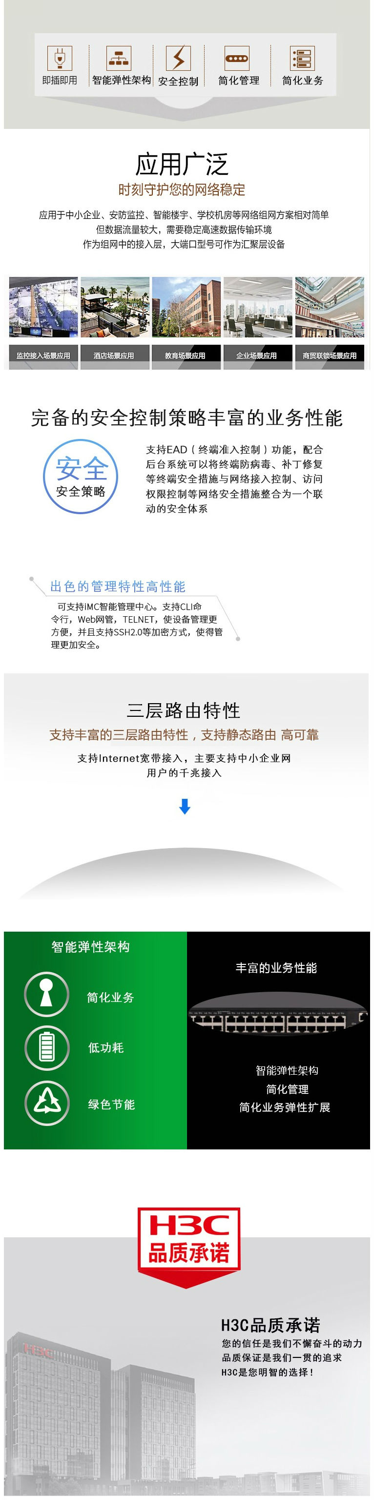 | 网络管理 | 支持命令行接口(CLI)配置,支持Telnet远程配置,支持通过Console口配置,支持SNMP(EImple Network Management Protocol),支持RMON(Remote Monitoring)告警、事件、历史记录,支持iMC网管系统,支持WEB网管,支持系统日志,支持分级告警,支持IRF,支持NTP,支持电源、风扇、温度告警 |